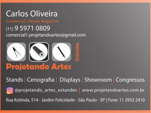 Olá, Sou o Milton, Gestor de Negócios da Projetando Artes Estandes, somos especialistas na produção de estandes e cenografia para eventos, bem como instalações de PDV's, lojas completas, quiosques, mobiliários, totens e displays. Nós imaginamos, criamos, desenvolvemos e executamos projetos de ambientes que encantam o público, valorizam o produto e impulsionam marcas. Com equipe qualificada e experiente atendemos as mais sofisticadas demandas de mercado com qualidade e exclusividade.
